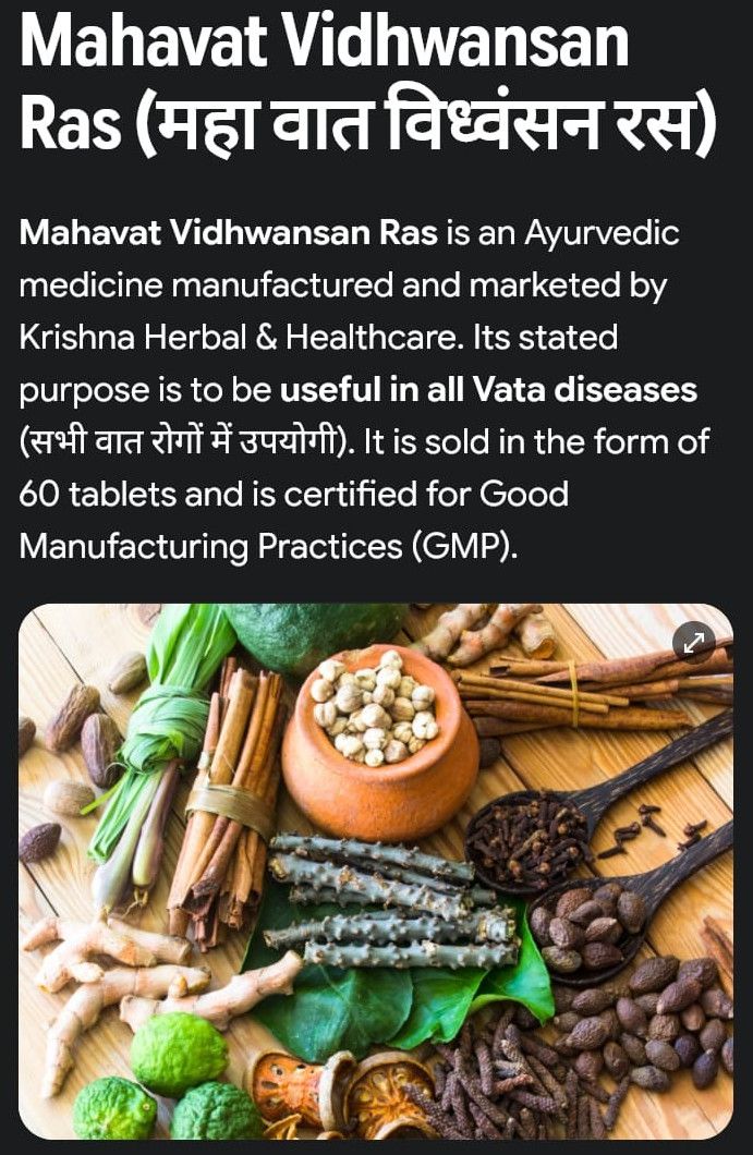 Mahavat Vidhwansan Ras is an Ayurvedic medicine manufactured and marketed by Krishna Herbal & Healthcare.