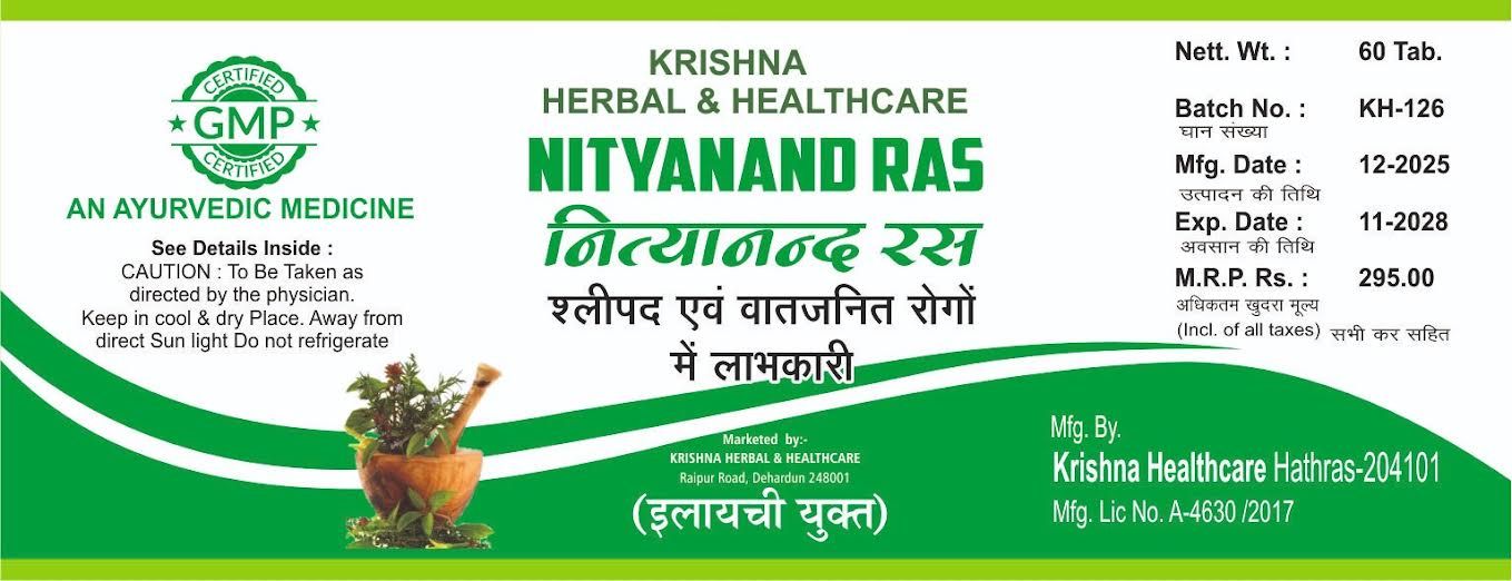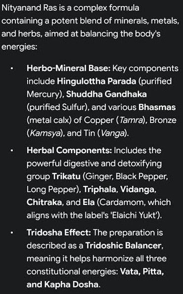 Nityanand Ras is a complex formula containing a potent blend of minerals, metals, and herbs, aimed at balancing the body's energies.