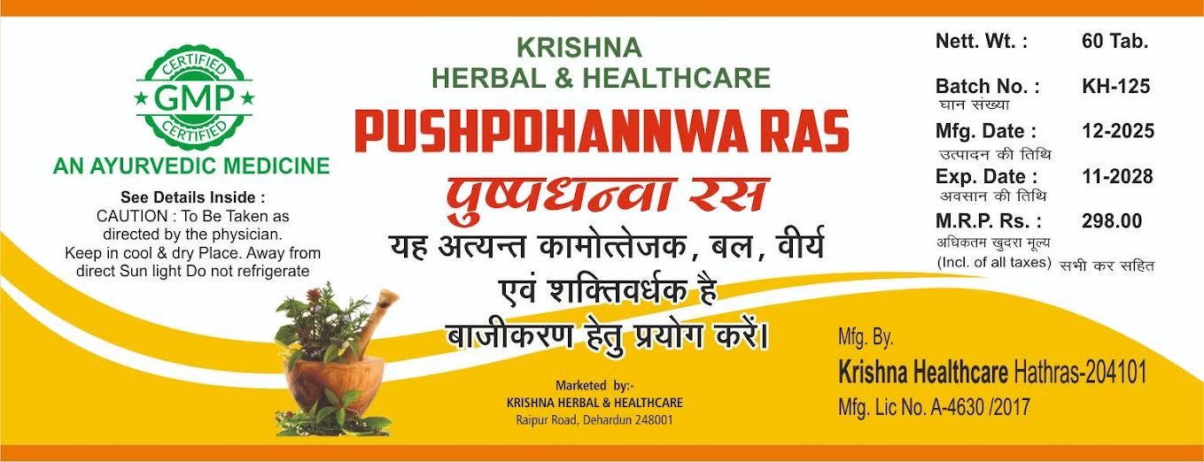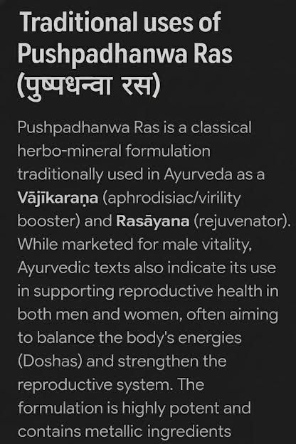 Pushpadhanwa Ras is a classical herbo-mineral formulation traditionally used in Ayurveda as a Vājīkaraṇa (aphrodisiac/virility booster) and Rasāyana (rejuvenator).